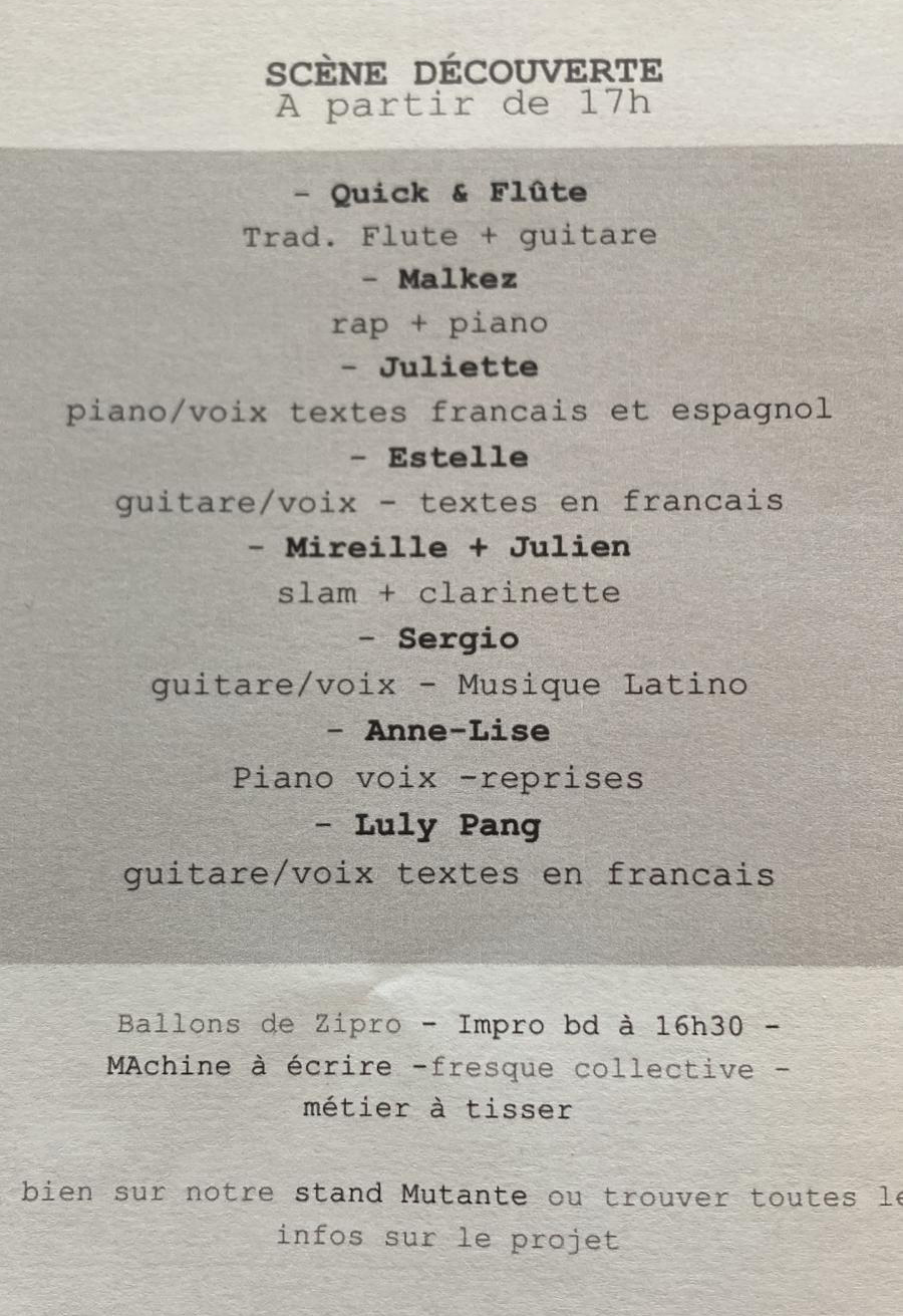 Scène découverte, Jam, fresque collective, impros BD, petit bar et apéro !Prix libre Adresse : 63A Rue de Faux, 1490 Court-St-Etienne (sous tonnelles, prévoir une veste) Envie de participer à la scène découverte ? Contact: info@lamutante.be ou 0479 233 647