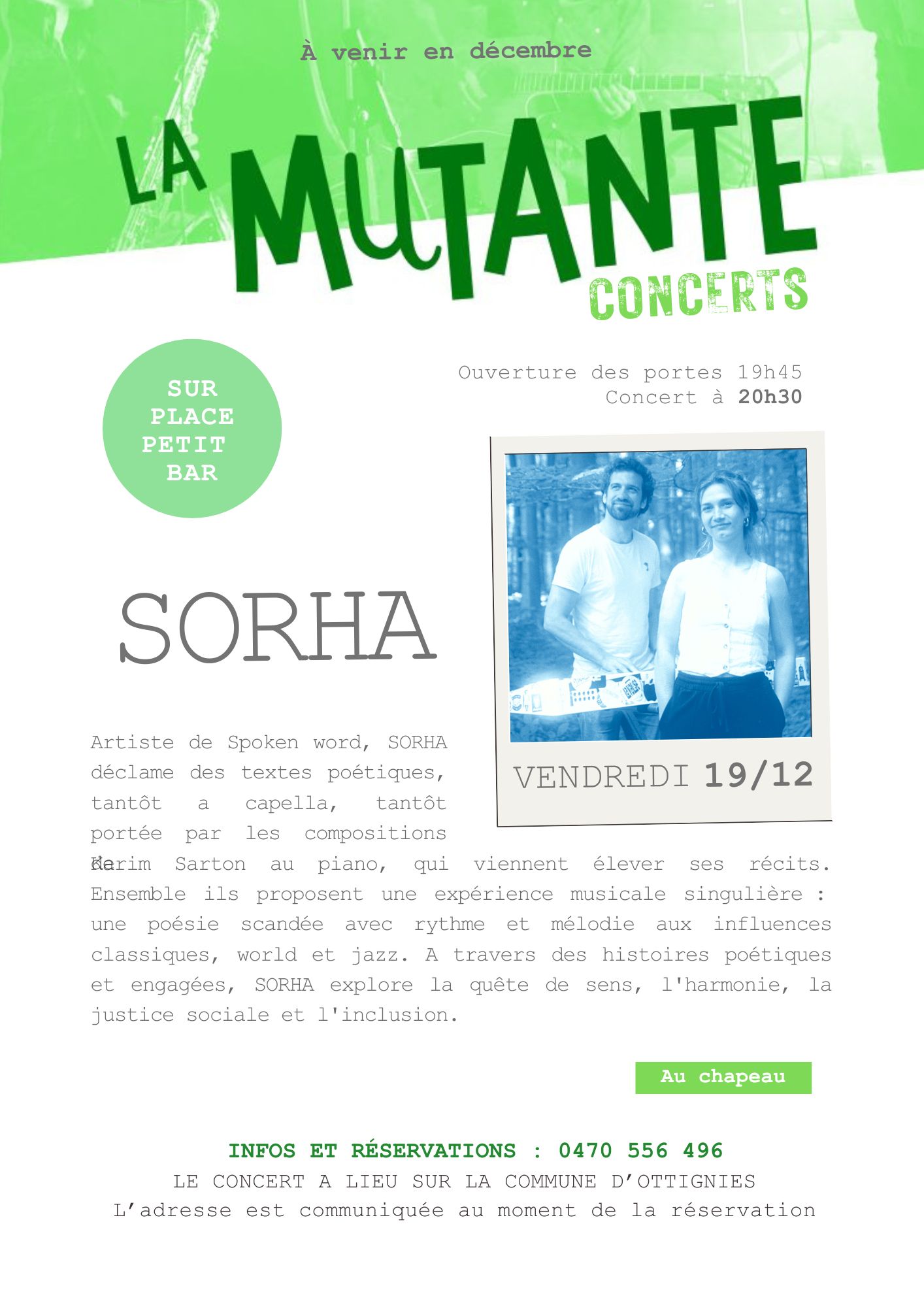 Finaliste du championnat francophone de slam, Sorha poursuit son élan et nous fait l’honneur de venir partager sa poésie : des textes emplis de sérénité, d’amour, d’enthousiasme et de générosité.